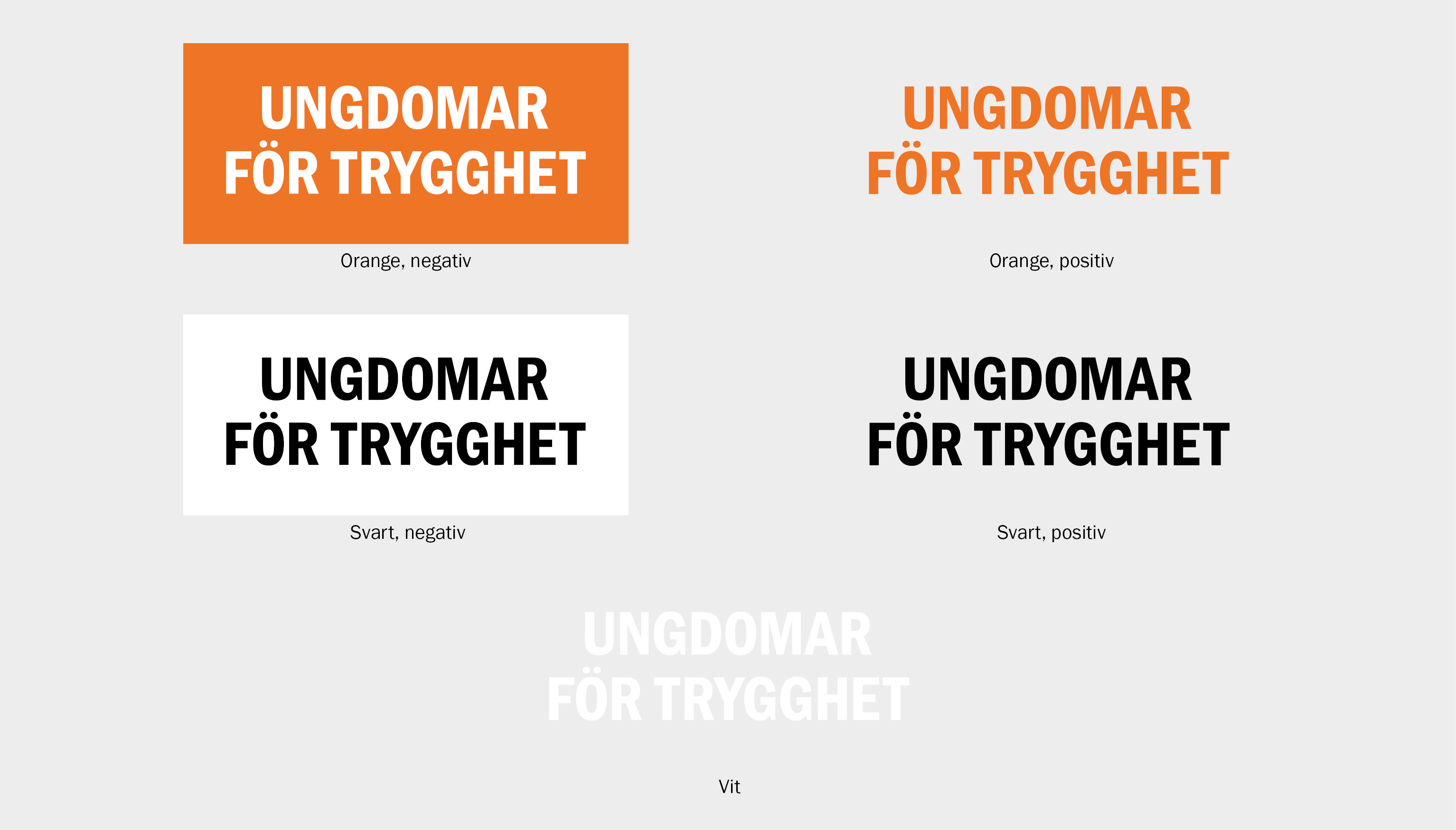 Ungdomar för trygghet har en textlogotyp som ska användas då det handlar om deras verksamhet. Logotypen finns i fem varianter: orange negativ, orange positiv, svart negativ, svart positiv och vit. Den orange negativa ska användas i första hand.